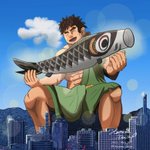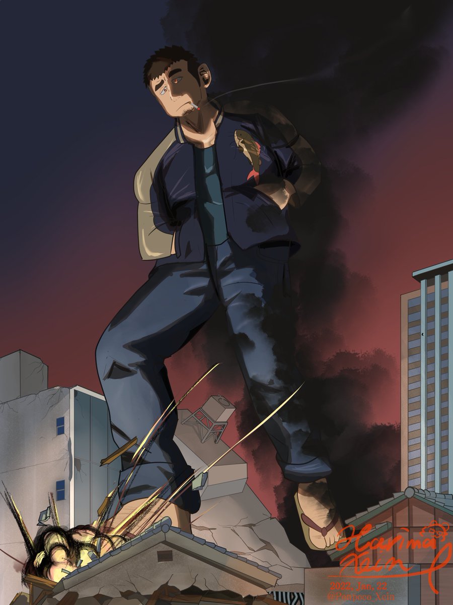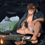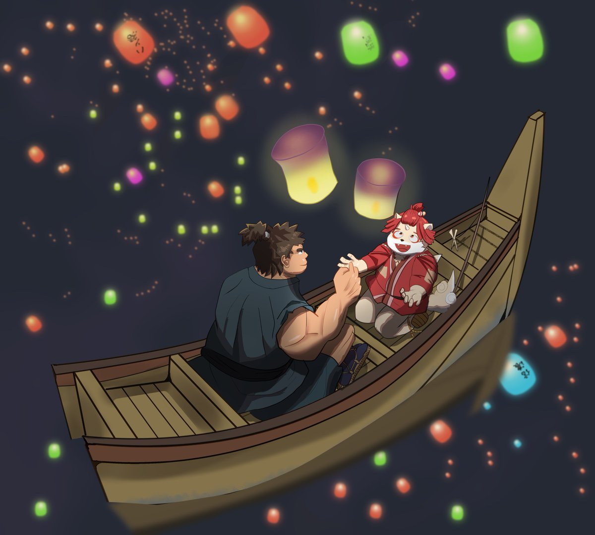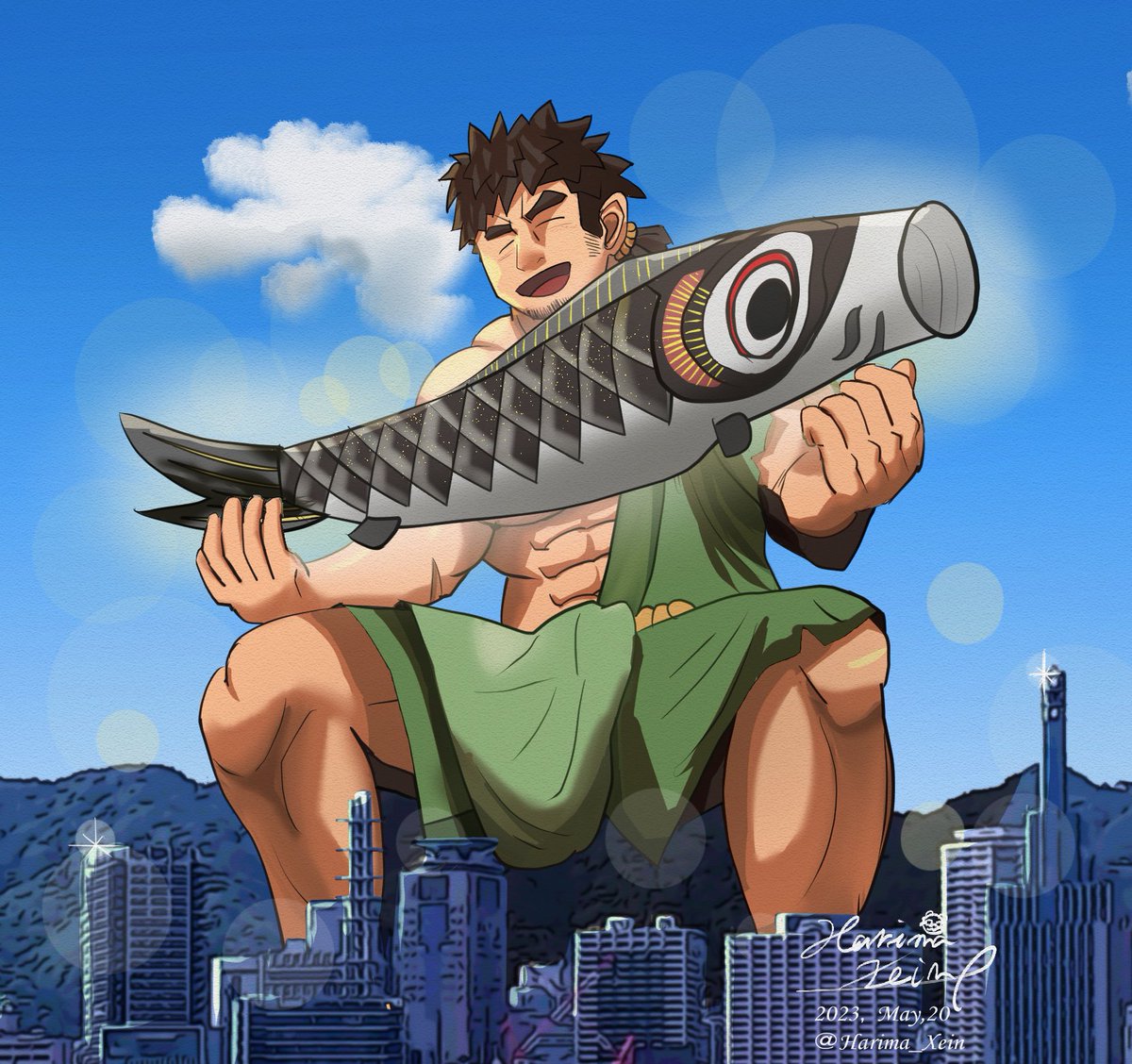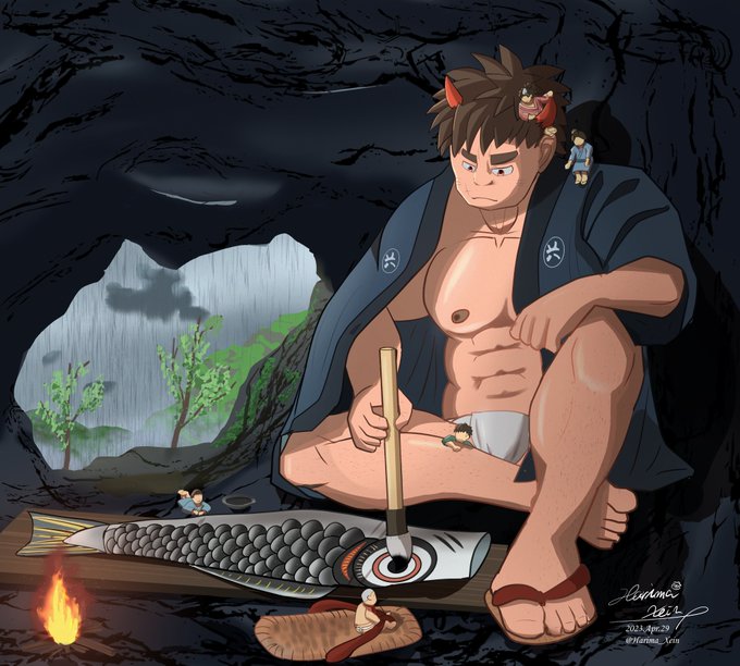#パス味博覧会inSummer 参加させていただきます! 左:蕪村の俳句から、うちの子である嵌六(カンロク)と子供たちを描きました。 右上:こどもの日をイメージして町の人を見守る巨人を描いたものです。 右下:これは以前描いたケモノ同人ゲームのキャラクターで、自分の最多いいね獲得しました!