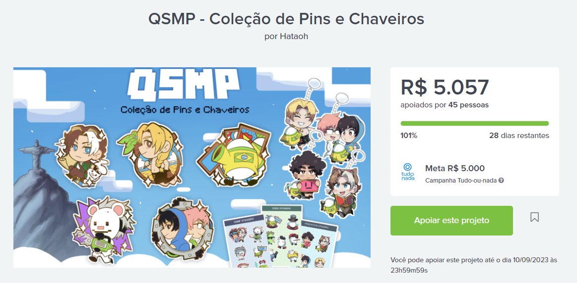 E A COLEÇÃO DE PINS E CHAVEIROS DE QSMP BATEU 100%!! Valeu de coração a todo mundo que está apoiando, prometo que vocês vão adorar todos os produtinhos <3 Ah, e ainda temos mais 28 dias de campanha, então corre que o link para apoiar está no tweet abaixo 👇 #QSMP #qsmpfanart