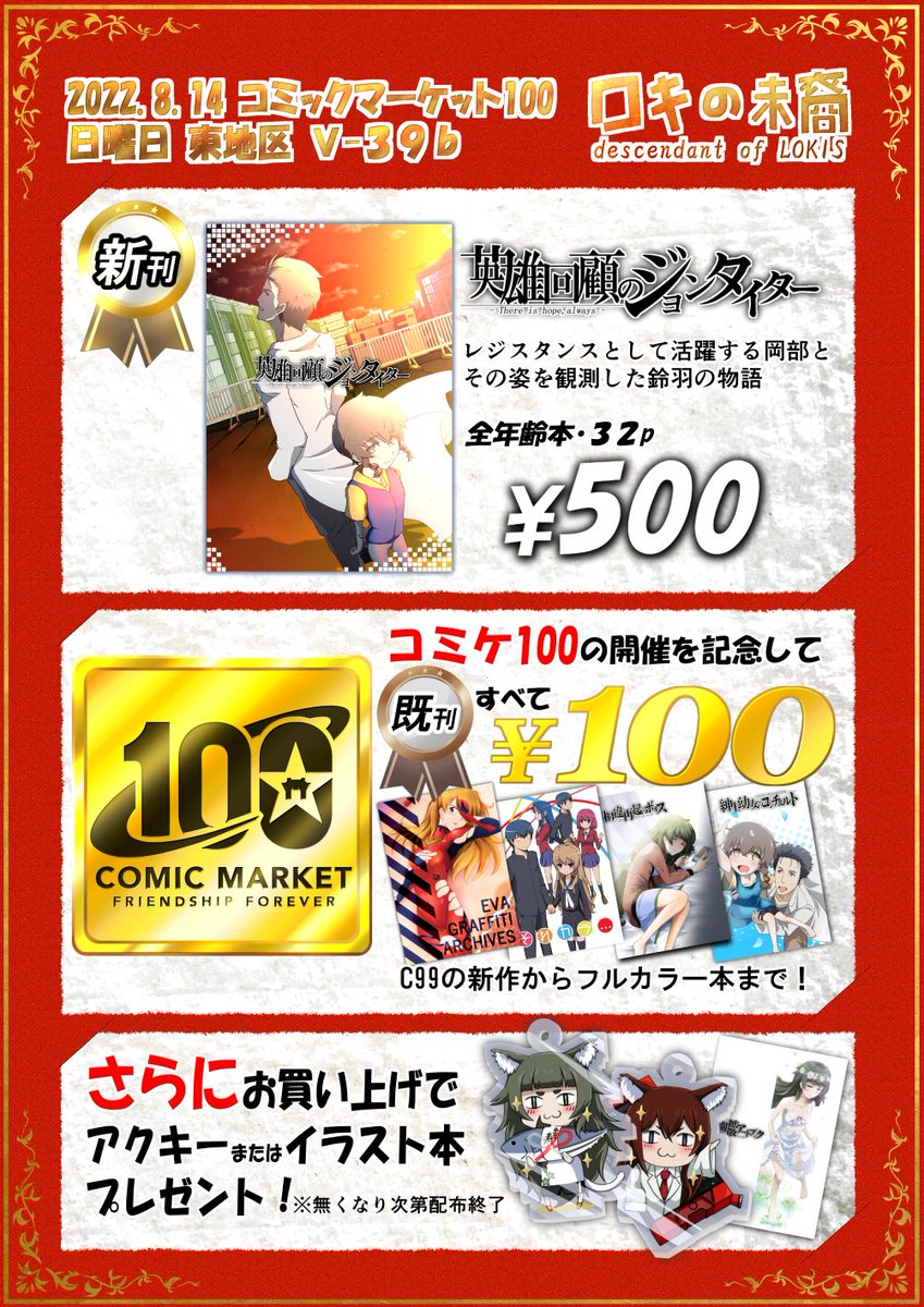 あなたのサークル「ロキの末裔」は、コミックマーケット100で「日曜日東地区 "V " 39b」に配置されました!コミケWebカタログにてスペース配置場所公開中です! webcatalog.circle.ms/Circle/Map/162… #C100WebCatalog あ、夏コミ出ます(・ω・)ノ シュタゲゼロの岡部&鈴羽本の予定…(たぶん)