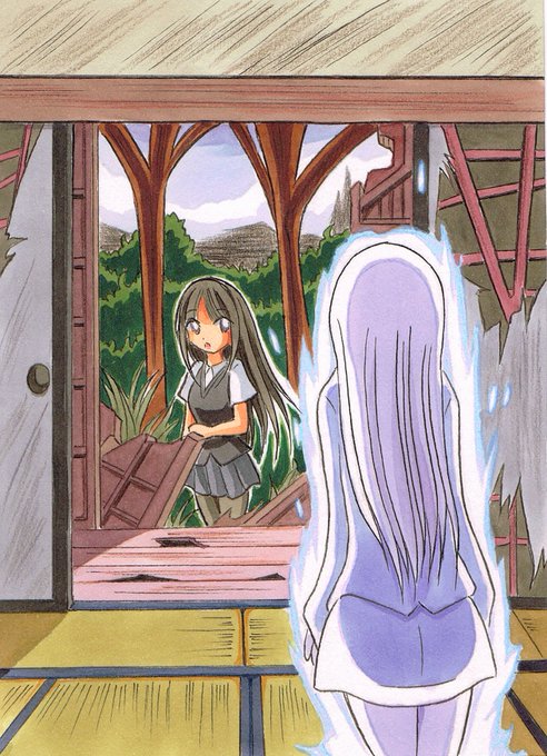 #イラスト 山奥の廃墟での 不思議な出会いを描いてみました✒️