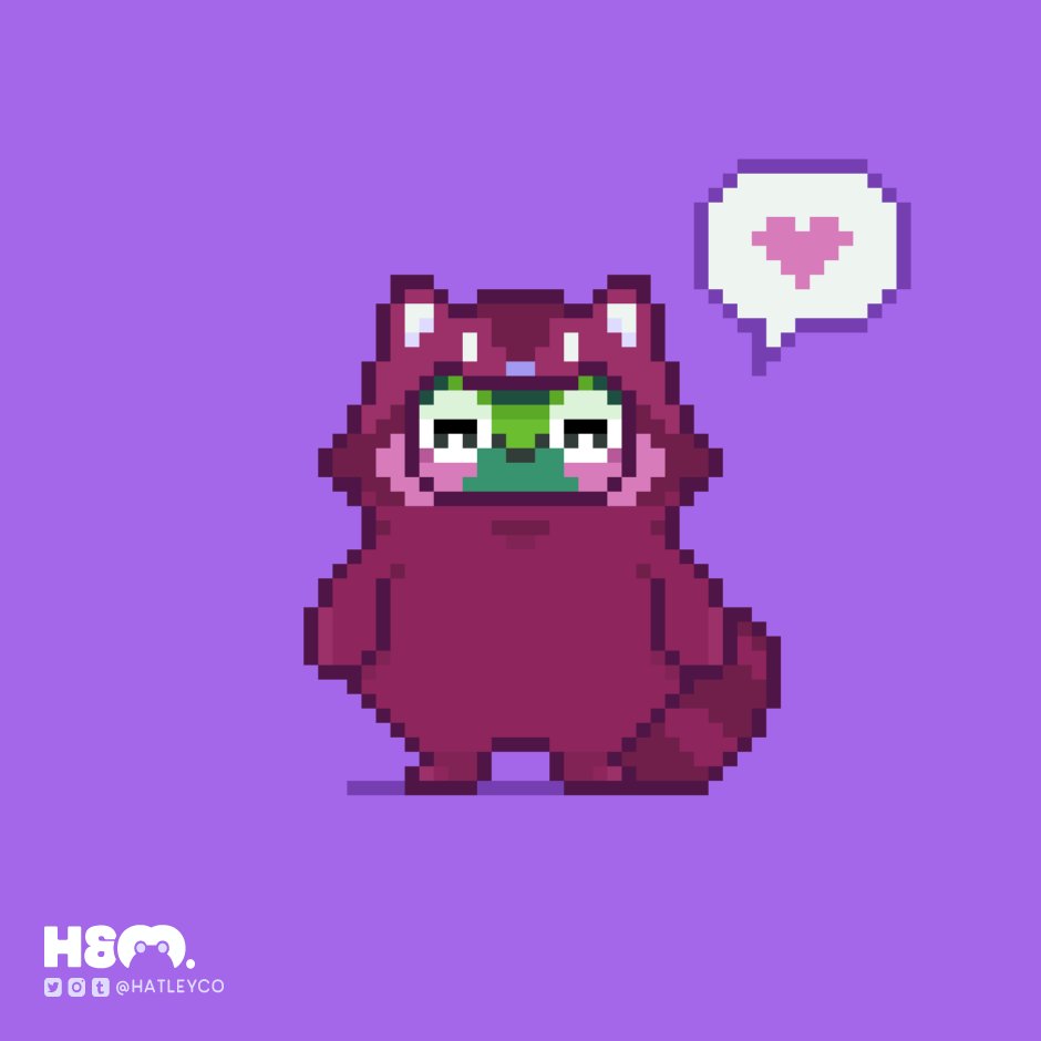 Hatley, our babie frog, all ready and dressed up as Mica, his raccoon-cat bestie~ one more week 'til #halloween2021! #pixelart #pixel_dailies #ドット絵