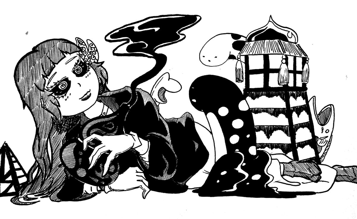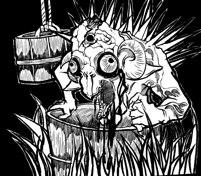 0 5 #ペン画 #イラスト 毎年生贄を求めるタイプの水神 頭の人面は去年の生贄のものです 23/07/15 18:22