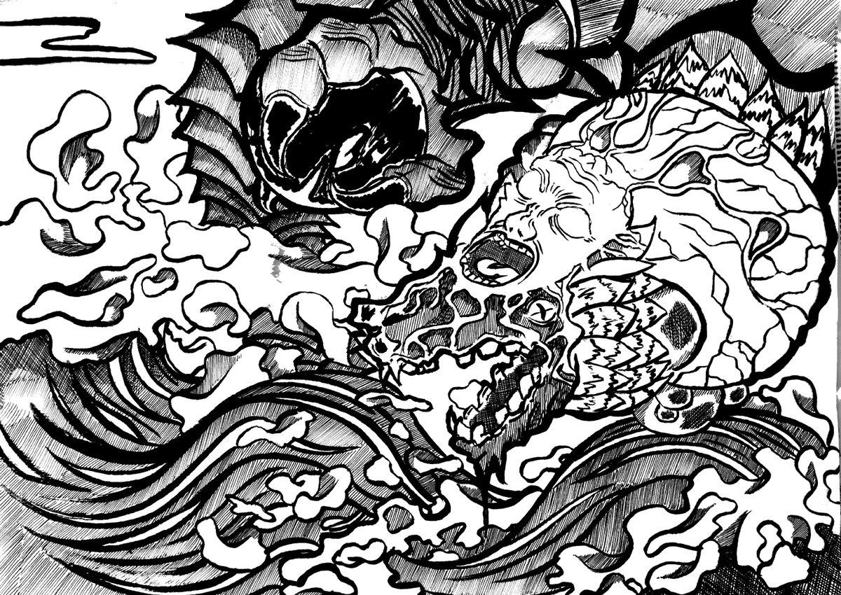 #ペン画 #イラスト 毎年生贄を求めるタイプの水神 頭の人面は去年の生贄のものです
