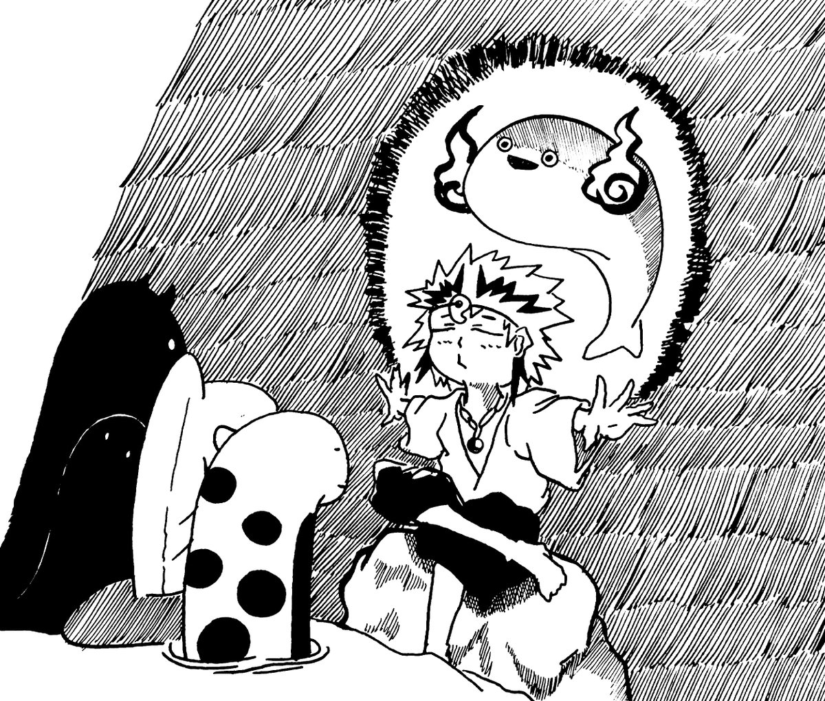 #ペン画 #イラスト サカバンバスピスに会うチンアナゴ 既に絶滅してるのでシャーマンに呼んでもらいます