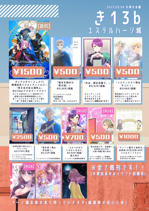 5/4のお品書きです!!!!基本既刊です!!!(全ての本の説明書きの記載を諦めました) リアルイベント初頒布のダンケルサマーフェス!!!開催記念アンソロ『青き炎の在る場所よ』が目玉です!!!!! 当日みのさんもいたりするかもしれません よろしくお願いします #女神の本棚GW2023
