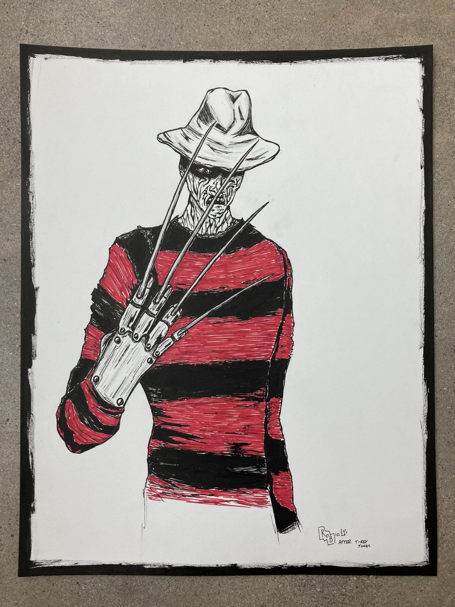 Day 27 #freddiekrueger drawing prompt for #kayfabetober #kayfabetober2022 - After t-rex Jones @CartoonKayfabe - #inktober #inktober2022 #illustration #comicart #comics #drawing #traditionalart #inkdrawing #manga #mangaart