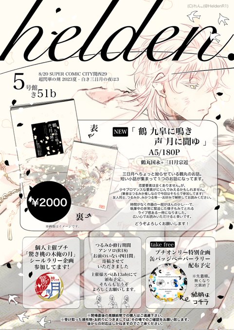 お品書き(1/5) 2023/8/20 SUPER COMIC CITY 関西 29 超閃華の刻 2023夏 白き三日月の夜は3 5号館き51b『helden.(へるでん)』 つるみかで新刊(1種)並べる予定です。 支部サンプル→pixiv.net/artworks/11096… →続