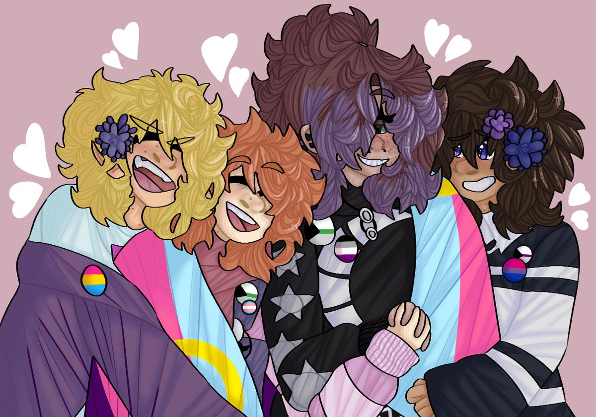 Finally made some art for pride month! I love drawing these characters so much, they're just all a bunch of lovebirds! #art #digitalart #ArtistOnTwitter #ocs #originalcharacters