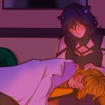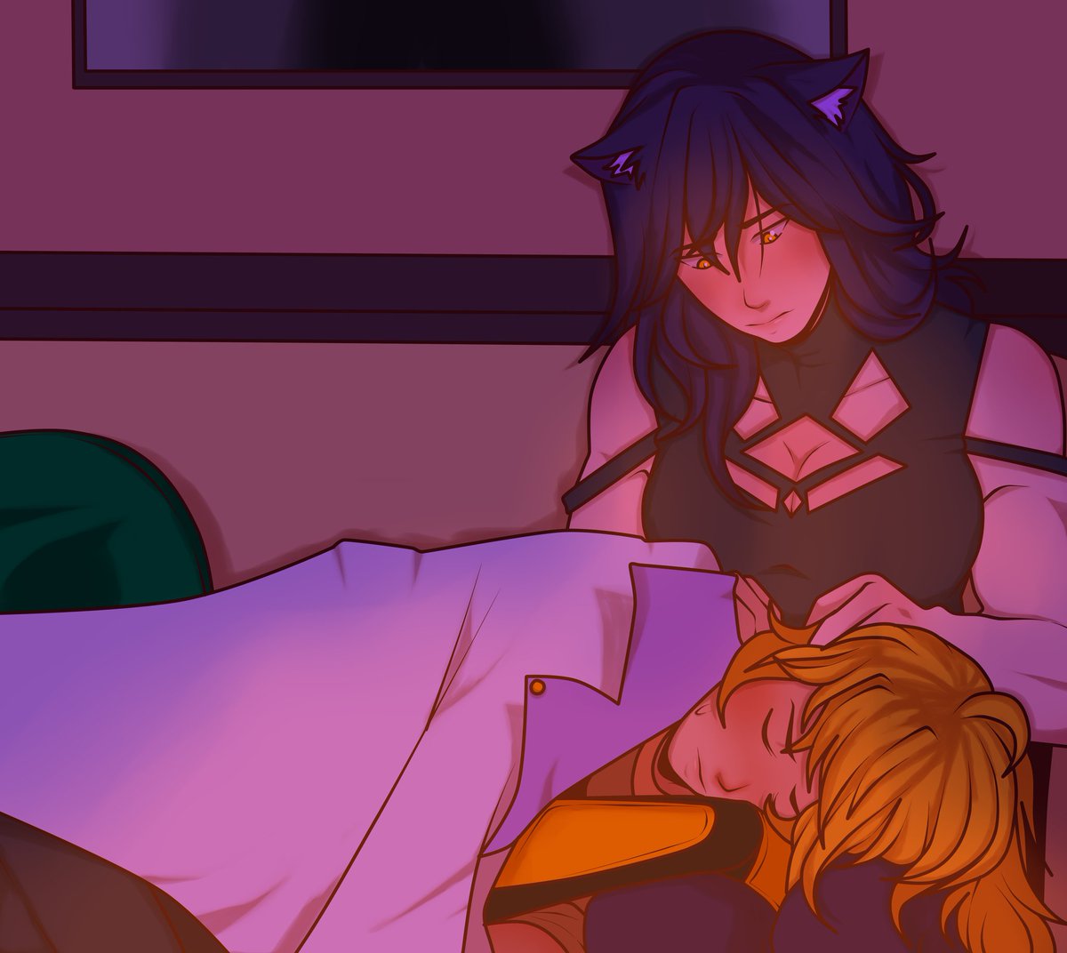 "Camera cuts wide to reveal Blake's blade mere inches from Yang's throat. Yang LAUGHS NERVOUSLY. Blake smiles." #RWBY #RWBYfanart #Bumbleby