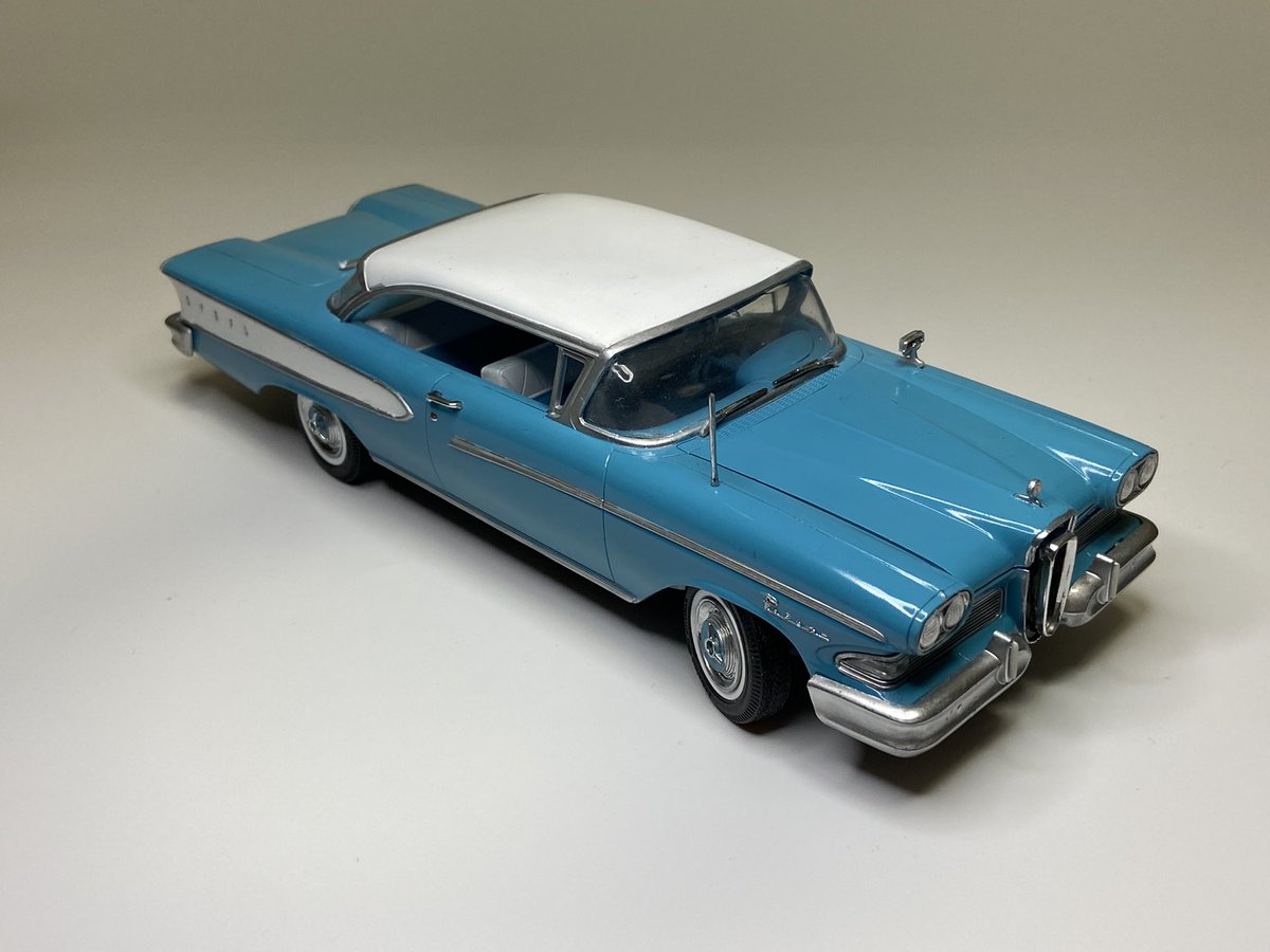 AMT 1/25 58年 エドセル ぺーサー 完成しました! グリルがとっても特徴的な車両です ターコイズとホワイトがとても気に入ってます キットはエンジンルームの精密感やメーターやハンドルのシフトボタンが再現されていてとても素晴らしいです #アメリカンカープラモ