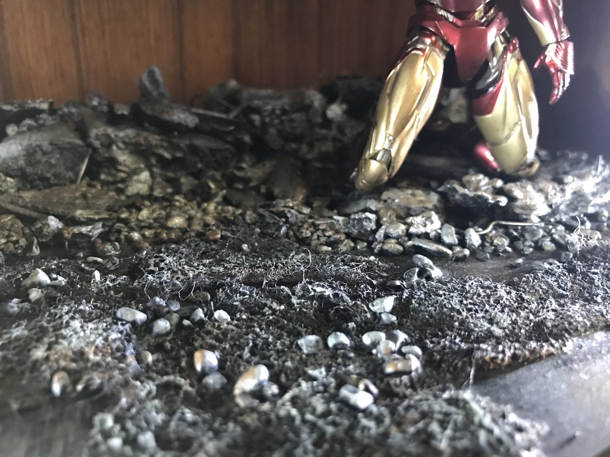 アーツの指パッチントニーを飾りたくて専用で作ったジオラマベース。まさか最後の最後に台座が付くとは思わなかったw 確かにポーズ的には台座がないとあんまり映えないからなぁ。 砂利、針金、ちぎったスポンジなんかで雰囲気出しました。 #アイアンマン #フィギュアーツ写真部 #エンドゲーム