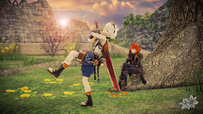 Bennett becomes brave and borrows Diluc's Claymore. He probably overestimated himself a bit! Models belongs to MiHoYo #GenshinImpact #genshinimpactfanart #Diluc #dilucragnvindr #bennett #Claymore #fanart #miHoYo