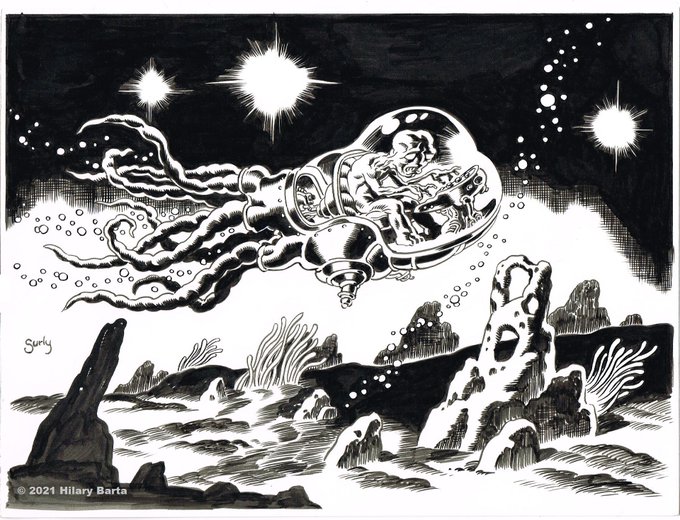 Once again it's #PortfolioDay, so... I'm Hilary "Surly Hack" Barta, and I make comical books and draw cartoon sci-fi noir. To see more Surly art: hilarybarta.com patreon.com/hilarybarta