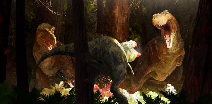 720 3351 An old commissioned piece depicting a pair of hypothetical Asiatic tyrannosaurines descendants attempt to drive an Albertosaurus off its kill. Partly inspired by Phil Tippet’s Prehistoric Beast amazing lighting. 22/01/21 23:09