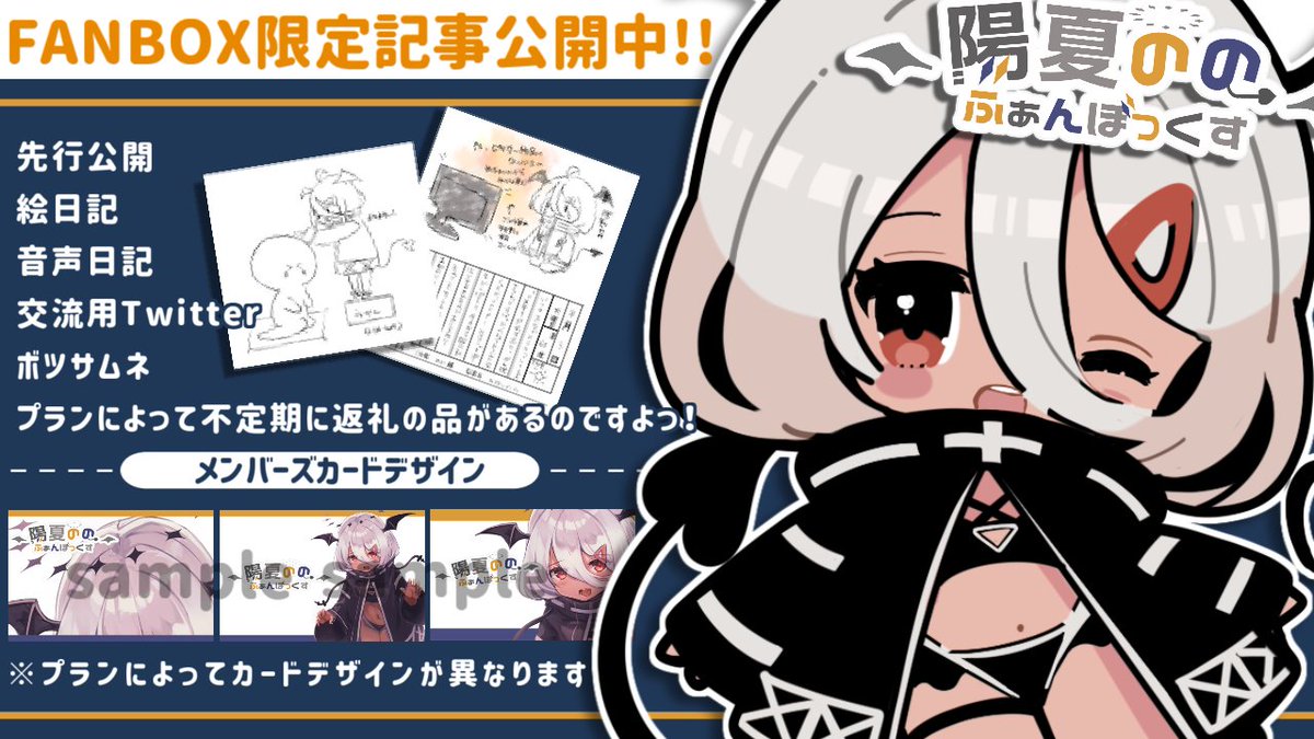 YouTube┊youtube.com/channel/UCPeF0… bilibili ┊space.bilibili.com/456749835 FANBOX┊hinatsunono.fanbox.cc GOODS ┊hinatsunono.booth.pm Skeb ┊skeb.jp/@HinatsuNono 干し芋 ┊amazon.co.jp/hz/wishlist/ls… Fan Mark┊🌻🦇 Fan Name┊のの組 ✦Tag 通常 #陽夏のの fanart #のの描いたよ