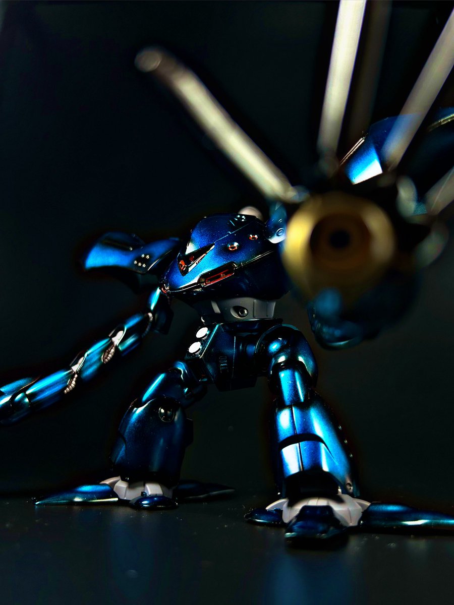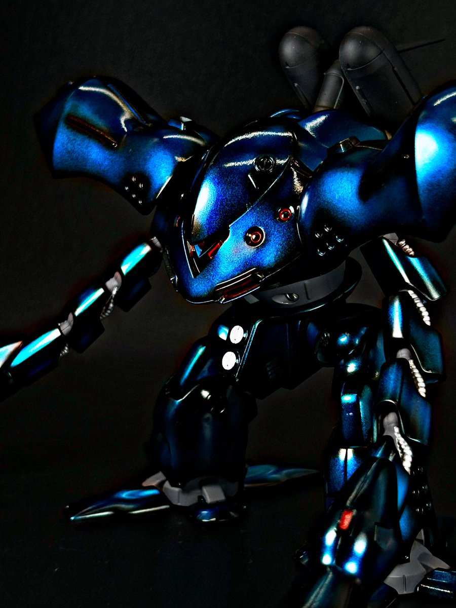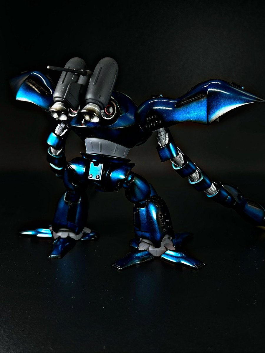 #梅雨のプラモ展示会 #プラモ新作完成 #ガンプラ #ガンプラ好きとつながりたい ガンプラ片手作成 HG ハイゴック キャンディ塗装に挑戦しました✨ シルバーの上から縁等を黒く塗るグラデ塗装"風"も試してみました😋 深いブルーで梅雨時っぽく!…見えるといいです!