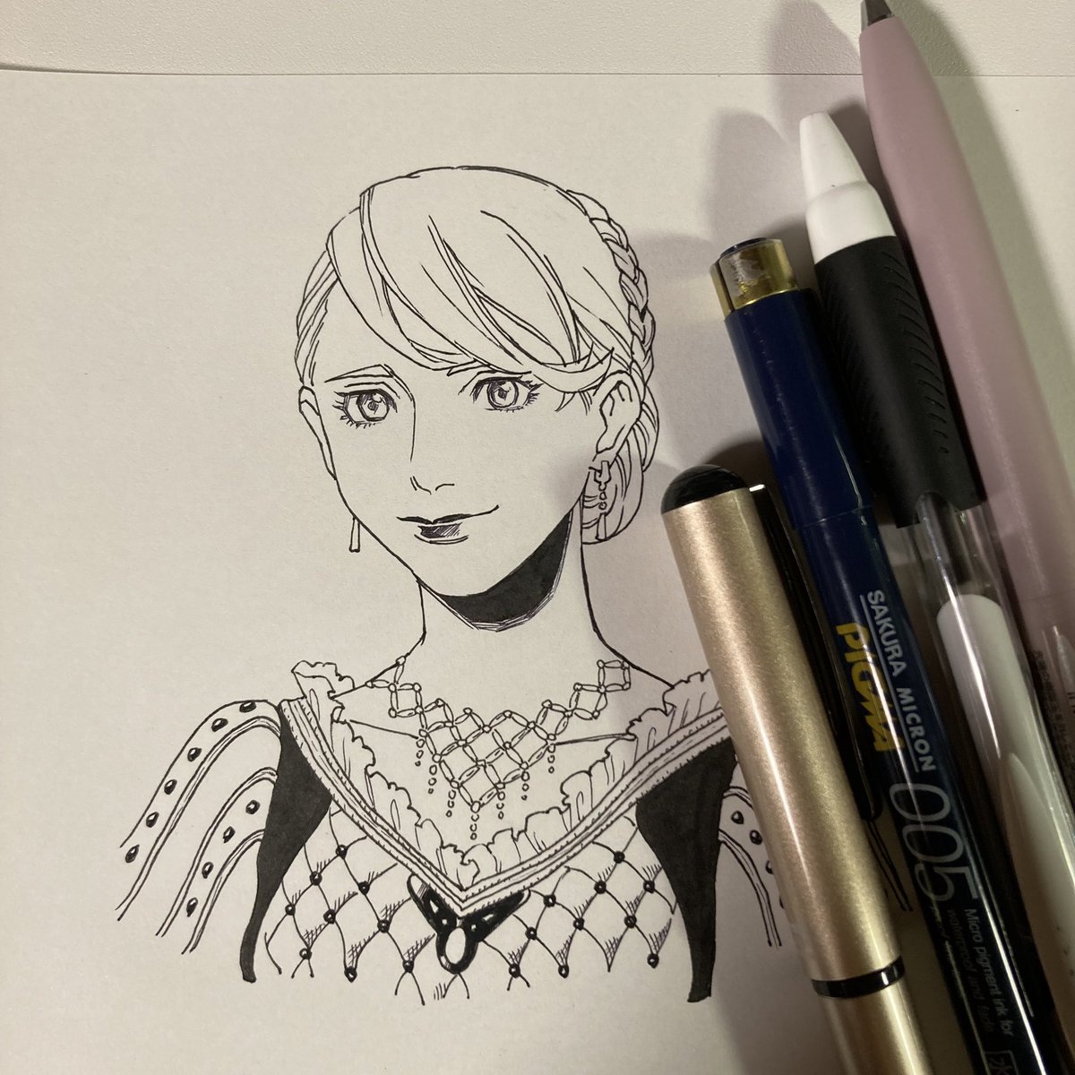 デジタルで綺麗な線が引けねー!ってんで8年ぶりくらいにアナログで落書きじゃない線画描いてみた…1時間くらいかかった…(何も意識しなかったらエセルネサンスな服装に)