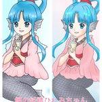 恋ひれ酒パッケージデザインになった初期のひれみちゃんを描き直しリニューアルして見ました❤️(パッケージデザインの変更ではありません) キラキラが増して可愛くなれたかな? 左が旧デザイン、右が新デザイン #イラスト #萌えキャラ #ご当地キャラ