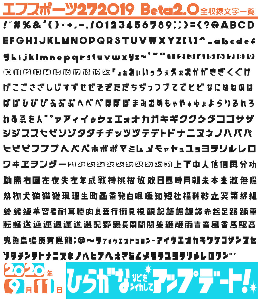 27時間テレビフォントこと フリーフォント「Fsports272019」が Ver.2.0にアップデートしました! 従来のに加え、「ひらがな」が追加されました! 今までダウンロードしてくださった方も、 また使ってない方もぜひチェックを! sinagi.booth.pm