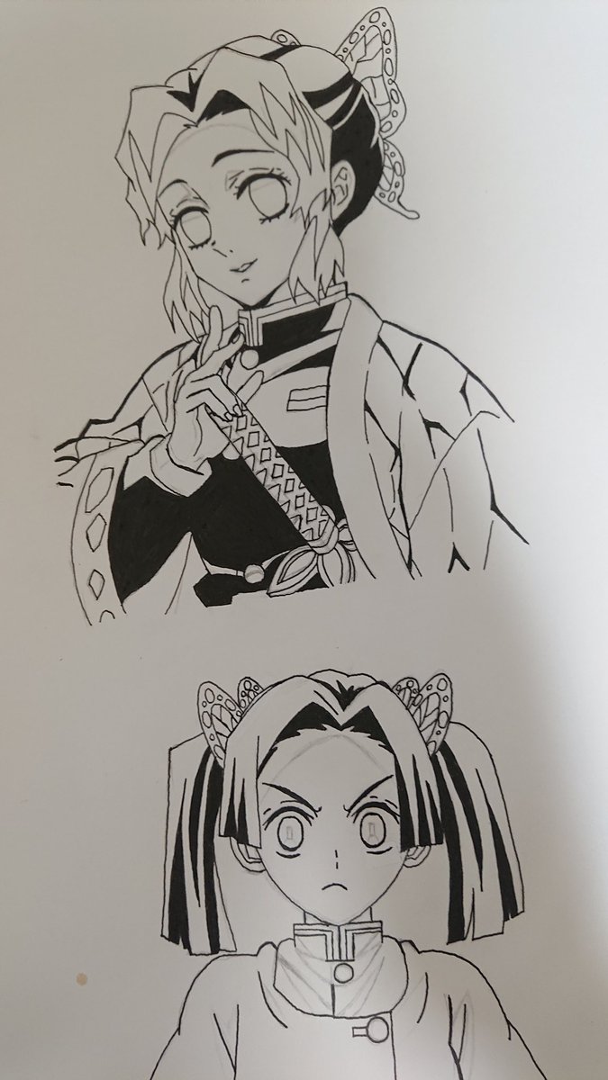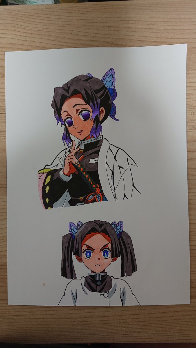 友達の娘ここなちゃん(もうすぐ8歳)のリクエストでしのぶ✏️でママの名前があおいちゃんだからついでのアオイ🦋初グラデーション壊滅的に下手+線画ミス→修正テープで撃沈😵😭その他色々やらかす😢💦 #胡蝶しのぶイラスト #神崎アオイイラスト #鬼滅の刃イラスト #イラスト初心者 #イラスト練習中