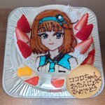 改めてココロちゃん( @rohto_cocoro )おめでとう!盛大にお祝いすべく実はこんなものも用意していました🎂藤ちょこ先生のお祝いイラストを前にパーティーです🎉 (いちご多め・髪の毛の特徴などをおさえてくださり丁寧に描いてくださったパティスリー・デコレ様に感謝!) #ココロAnniv3rd #CocoroArt