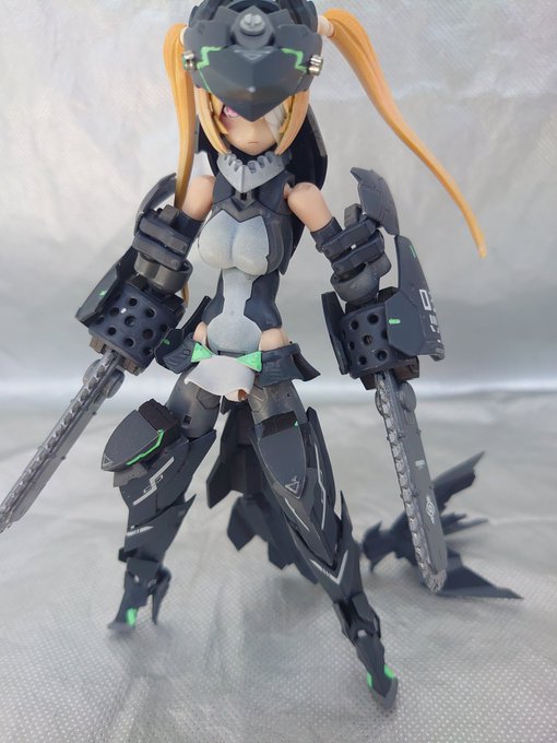年末の5周年オフ用に作ったものを修理+一部改修しました。 俺メガミ第3号、朱羅蒼衣カスタム 鮫型メガミ「ノコギリザメ」 頭部ソナー、両腕のチェーンソーにより索敵能力及び近接戦闘能力を向上させた水中用機体です。 #メガミデバイス