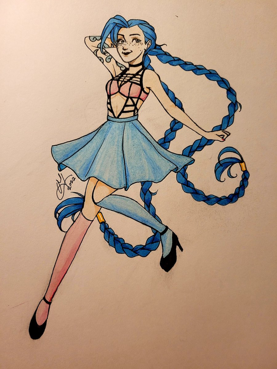 Ok I'm kinda milking my audience today BUT this one's special so- A traditional Jinx for my sweet little sister💙💗 haven't done a full traditional piece in like a year so this was refreshing honestly! #Jinx #jinxfanart #traditionalart