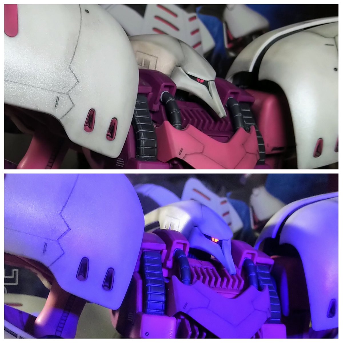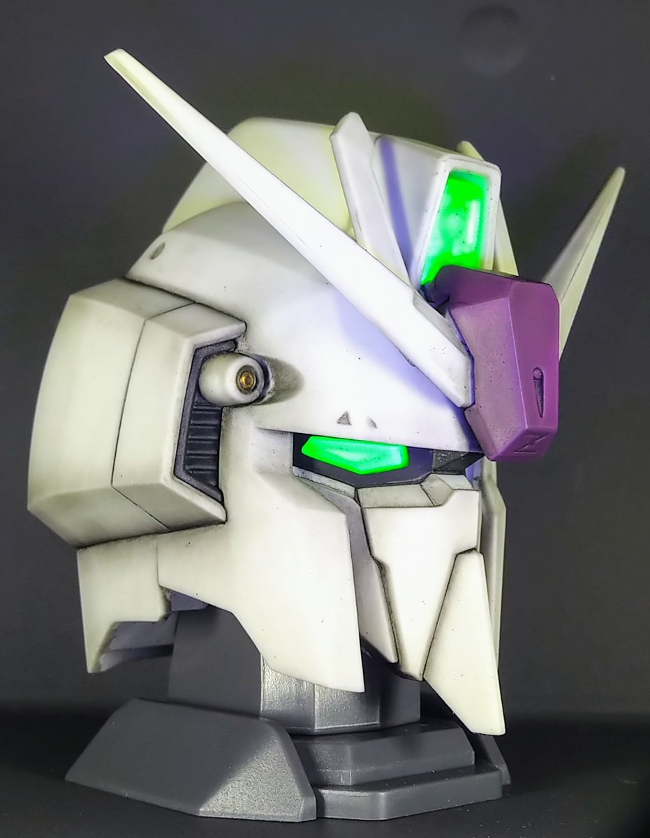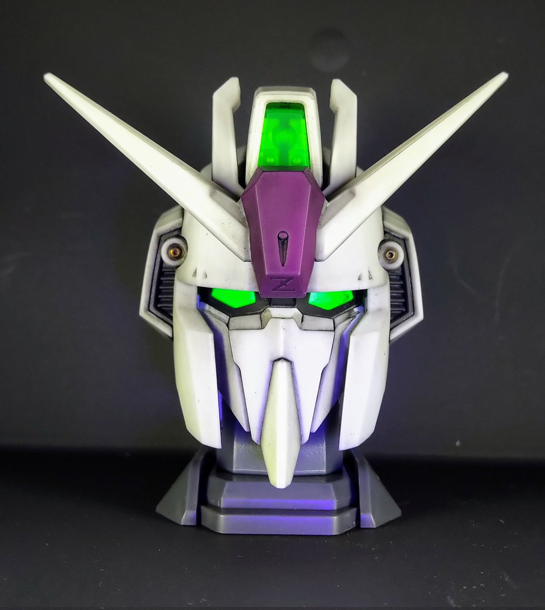 ガチャガチャのゼータヘッド/ゼータガンダム3号機をウェザリングで陰影強調しました。 バルカン砲にダイソーのゴールドビーズでディテールアップ。 サイズピッタリで良かった(^^) モノアイ、センサー部は蛍光塗料が混ざってるようで、UVライトで光ります✨ #ガンプラ #ガンプラ好きと繋がりたい