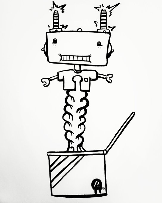 Inktober Day 14 "Pop Goes the Bot" #inktober2020 #Inktober #ArtistOnTwitter #cringetober #originalart #characterart #Robotics #toys #cute #electricity #power #cartoon #traditionalart #grunge #asthetic #goals #PositiveVibes #Motivation #WednesdayWisdom #design #metals #fun