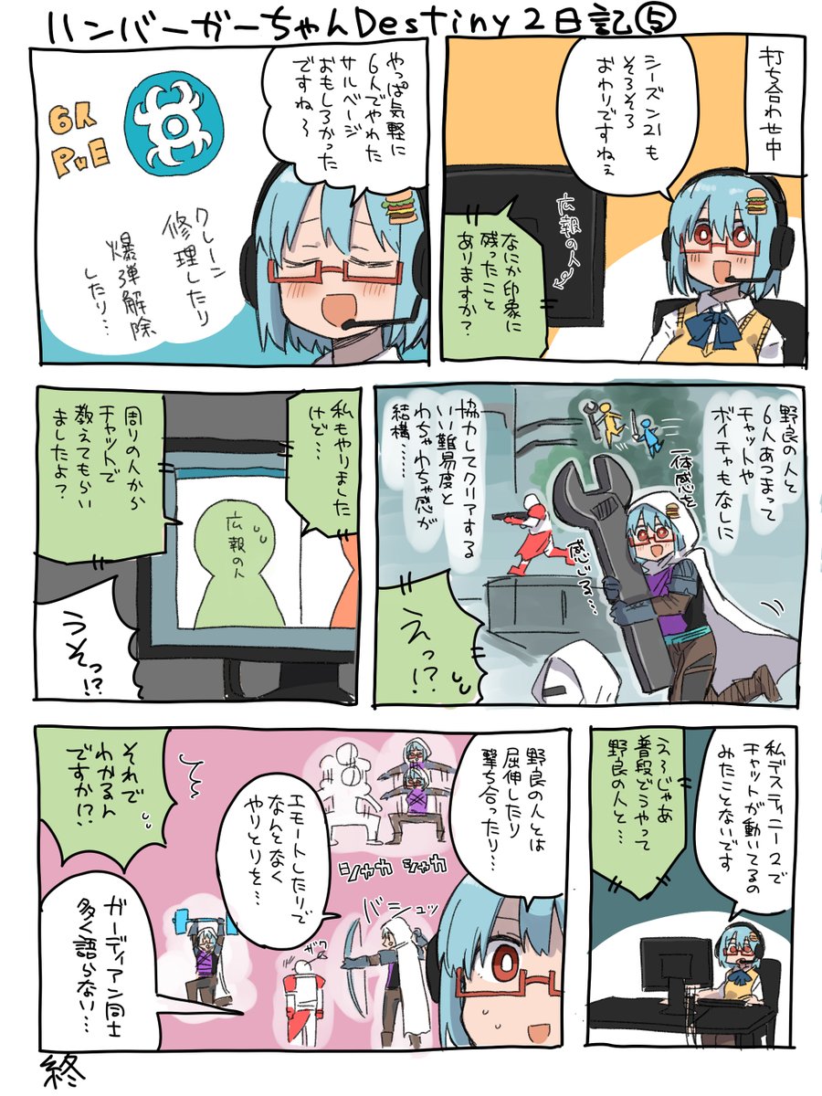 出来ましたハンバーガーちゃんDestiny 2日記が。 テキストチャットでやり取りしたことがありません。