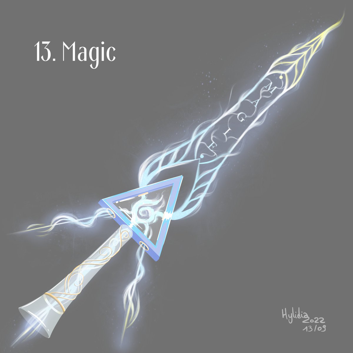 Day 13: Magic A pure magical masterpiece, this sword was given to lady Galadriel Riesco, the ruler of the House of Magic, by a man who wished to win her heart. The shape of the handle and the guard takes up the symbol of the house. #swordtember2022 #swordtember