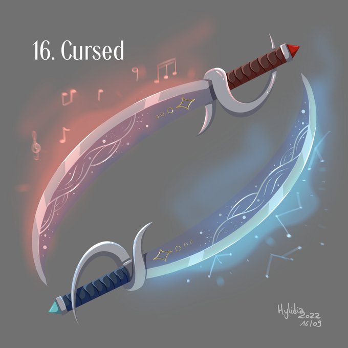 Day 16: Cursed Complaint and Requiem, the swords as cursed as their owner. One attacks what keeps you in the world, the other knocks anyone into total unconsciousness with its sweet melody. It's said that these swords come from a wish-granting river. #swordtember2022 #swordtember
