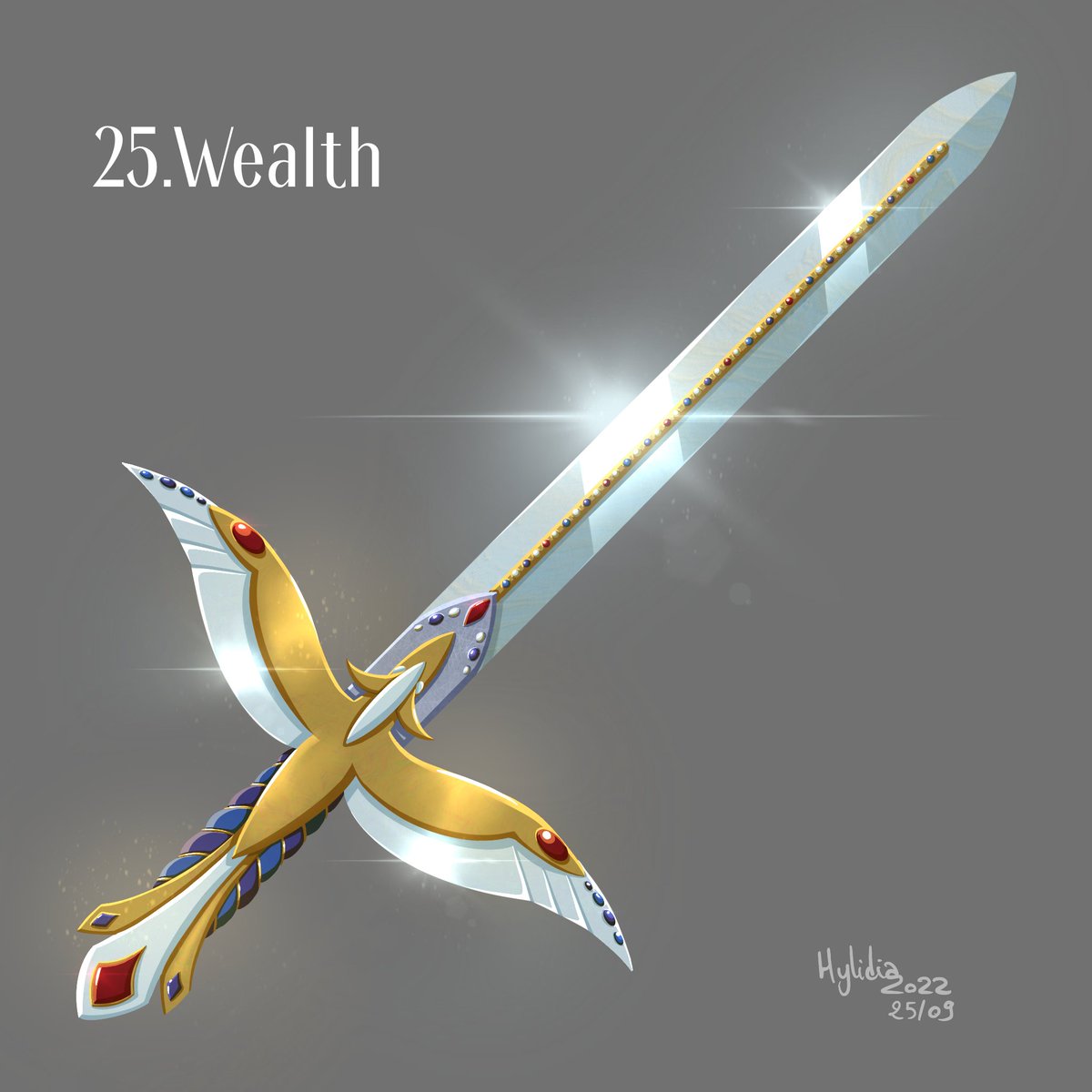 Day 25: Wealth This regal sword was crafted to show off the wealth of the Vifenix's kingdom. The Phoenix on the guard had to be redone 3 times before the king was satisfied with the work. The king represents the spirit of the Phoenix after all... #swordtember2022 #swordtember