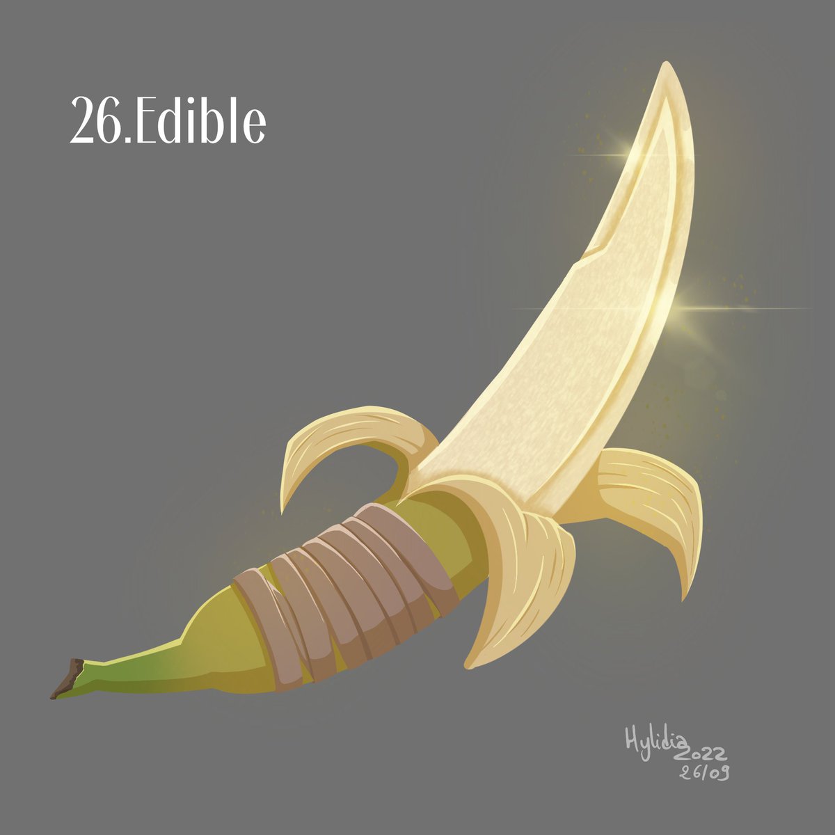 Day 26: Edible One day, when a simple man was robbed by a thief, he managed to defend himself by using the only object he had in hand: a banana. As surprising as it may seem, the banana had become as sharp as a knife and stayed that way forever. #swordtember2022 #swordtember