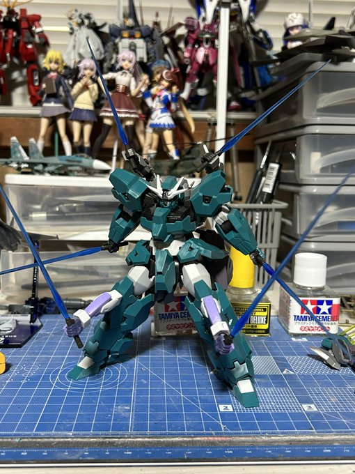 32 134 ガンダムルブリスを量産型風に改造してみました。 背中は30MMのパーメインで構成、背部のブースターユニットに4機のビットを搭載(2機は台座の都合で飛ばせてない)してます。 配色はミリタリー風にグリーンとグレーで塗りました リプ欄に追加の写真あります 22/12/09 21:12