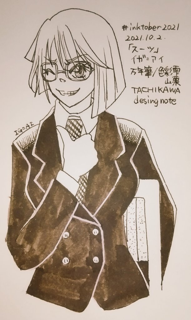 0 4 アナログ画材ほとんど使ってなかったからめちゃくちゃ腕落ちてる… 特訓特訓~! インクトーバー2021 「スーツ」 #inktober2021 #Inktober #絵描きさんと繋がたい #色彩雫 山栗 #万年筆 #illustrationartists #イラスト練習中 21/10/02 17:22
