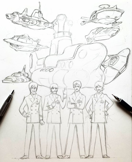 プレゼントとして描いた絵ですが色々と学習させて頂いて、何より喜んで頂けて良かった! 艦艇は全て無理矢理に黄色にしています。 #イラスト