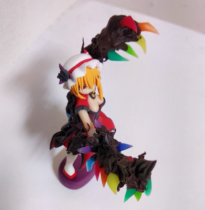 樹脂粘土でフランドール(重攻撃形態B)が完成。 背中の副腕とバキバキに生えた宝石結晶が、手にしたレーヴァテインを無理矢理巻き込むようにして剣(の形状をした鈍器)を形成している感じです。 #東方Project #フランドール・スカーレット
