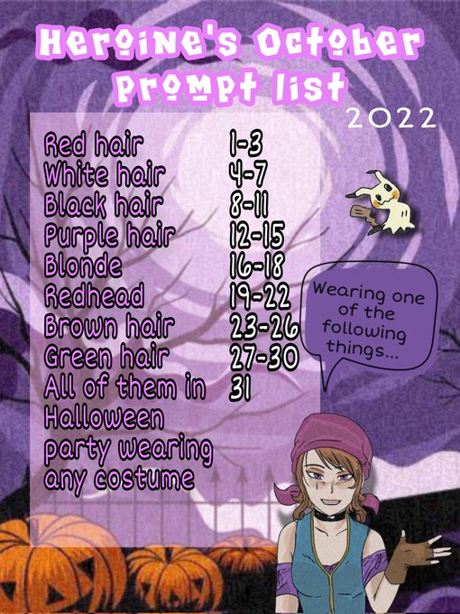🦇OCTOBER PROMPT LIST 🦇 LISTA PARA TU PROPIO INKTOBER Es de mi agrado traerles está lista que hice para conmemorar el #Inktober2022 🎉 Aquí, puedes usar personajes que te gusten que tengan cabello de color que digan en la lista, que en español son: Del 1 al 3 de octubre: 👇