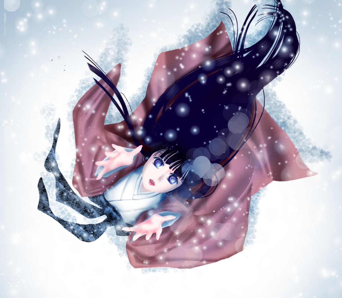 一年前に描いた絵です 姫神の曲で「青らむ雪のうつろの中へ」というのがあり、そのイメージで描きました。 見る人で物語を想像してもらえればいいのですが私は「最愛の恋人と引き離され嫁がされた少女が病を患い余命少ない中恋人に会いたいあまり外に飛び出し手を伸ばす」という話を想像しました