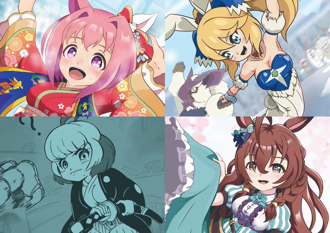 #2023年自分が選ぶ今年上半期の4枚 顔をかなり似せられた気がするハルウララ ライダーにモンスターにバニーに背景にと描く要素盛沢山だった年賀 変わったネタに触れた なまくら刀 初描き推しウマ娘のメジロブライト の4枚で。 フルサイズはリプ欄からどうぞ。