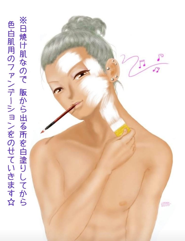 男アバターのチンピラが 女アバターの夢女さんに チェンジする為に女装を するのを描いてみました 先ず良い色に日焼けした肌を 白塗りにしてからファンデを のせていくスタイルの様です #男子イラスト #どう森美術部 #ポケ森自アバターイラスト
