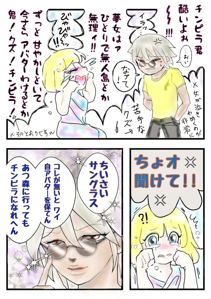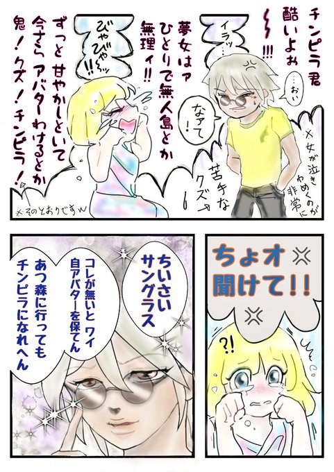 1 69 ポケの方に残りたい チンピラに 無理やり先に 無人島の開拓へと 送り込まれた夢女さん😅ですが ずッと 生活全般 チンピラ頼みで クマロス様💖との 恋愛の事だけ 夢見てきた彼女の生活力は皆無! 早くも限界!!(笑)早々にフレさんに 助けて貰って サングラスと厳つい 服をGETしチンピラに救助依頼💌 20/04/07 19:00