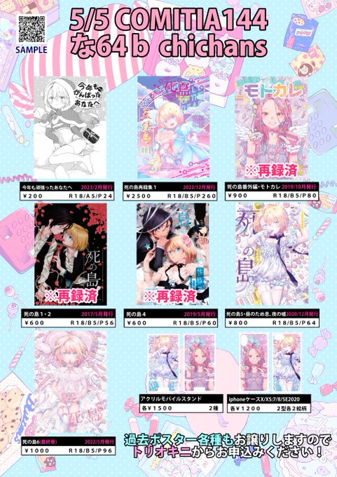 #COMITIA144 お品書きです!サークルchichansは【な64b】マチさん( @tamani_imasuyo )と隣接です! 今回お取り置きは ・過去ポスター ・再録集1 ・スケブ (事前にある程度把握しないと対応できない三銃士)のみで受付しようと思います!お申し込みはこちら👇 triokini.com/circle/item/li… #創作BL