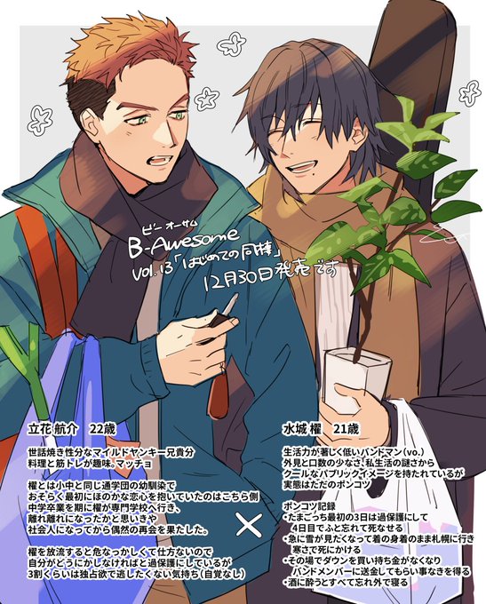 【お仕事】 12月30日発売『B-Awesome』Vol.13はじめての同棲 世話焼き兄貴分×ポンコツバンドマンの二人で表紙&特典小冊子&特典ペーパーを描かせていただきました!どうぞよろしくお願い致します。 通販予約🍳ecs.toranoana.jp/joshi/ec/item/… タペストリー🍳ecs.toranoana.jp/joshi/ec/item/… #B_Awesome