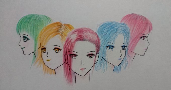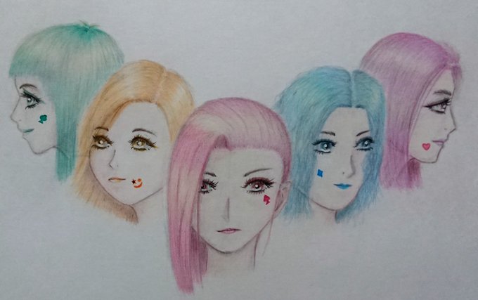 #オリキャラ #色鉛筆画 estar.jp/novels/25263979 私小説第二章に登場する【ZーHAR】という5人組ガールズユニットを描いてみました✨