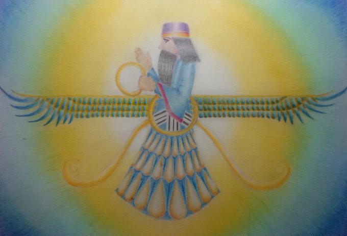 イランでイスラム教が栄える遥か昔のペルシア帝国(現イラン)時代で最も栄えた宗教の一つであるゾロアスター教最高神アフラ・マズダを描かせていただきました😌 #絵描きさんと世界旅行 #イラン #ペルシア帝国 #ゾロアスター教 #アヴェスター #アフラ・マズダ #拝火神殿