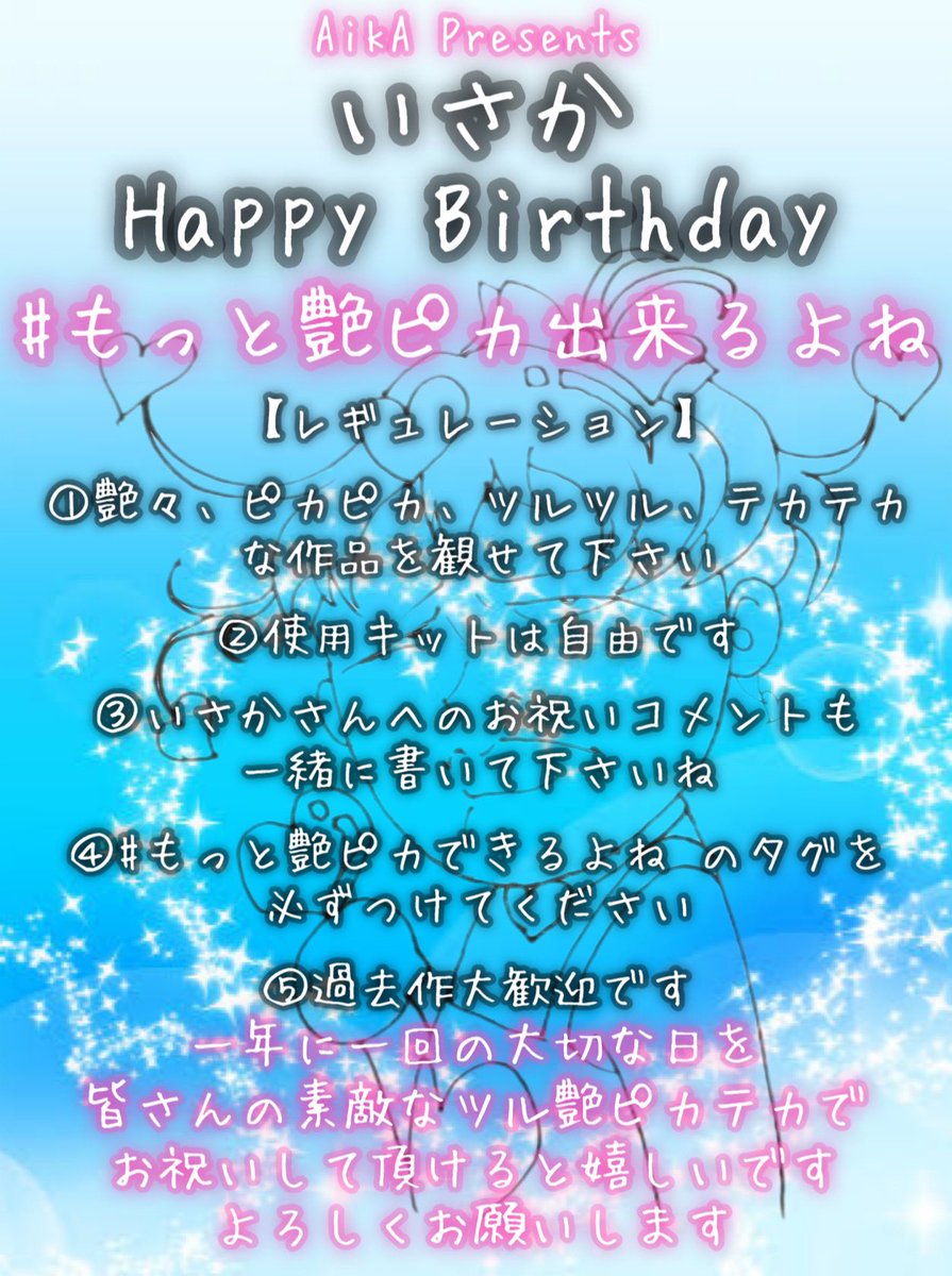 #いさか誕生祭2023 #もっと艶ピカ出来るよね 告知ポスターとレギュレーションが 出来上がりました💕 AikAがいつもお世話になっている いさかさん@zcusQvkJWKF4WyK の誕生祭です 一年に一回の大切な日を 皆さんのツルピ...艶ピカ作品で 眩しくしませんか?🤩 詳しくはレギュレーションを参照下さい