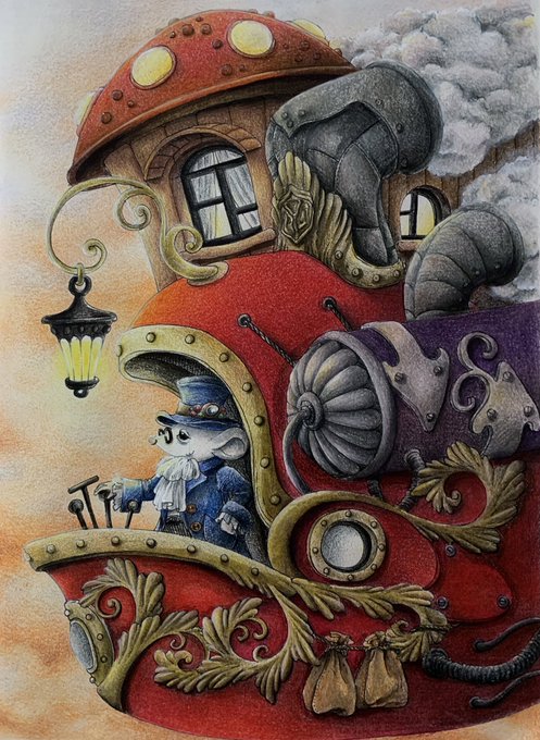 蒸気的飛行少女 @kuroimori_twee #大人の塗り絵 #色鉛筆 #ヴィクトリアン幻想図鑑黒イ森ぬり絵ブック