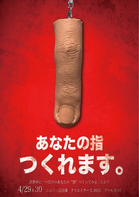 24 155 4/29~30のニコニコ超会議は指キーホルダーワークショップの他に誰の指が出るか分からない指ガチャや、Twitterで大人気の美大生の手の販売を予定しています!是非来てください! 23/03/27 16:40
